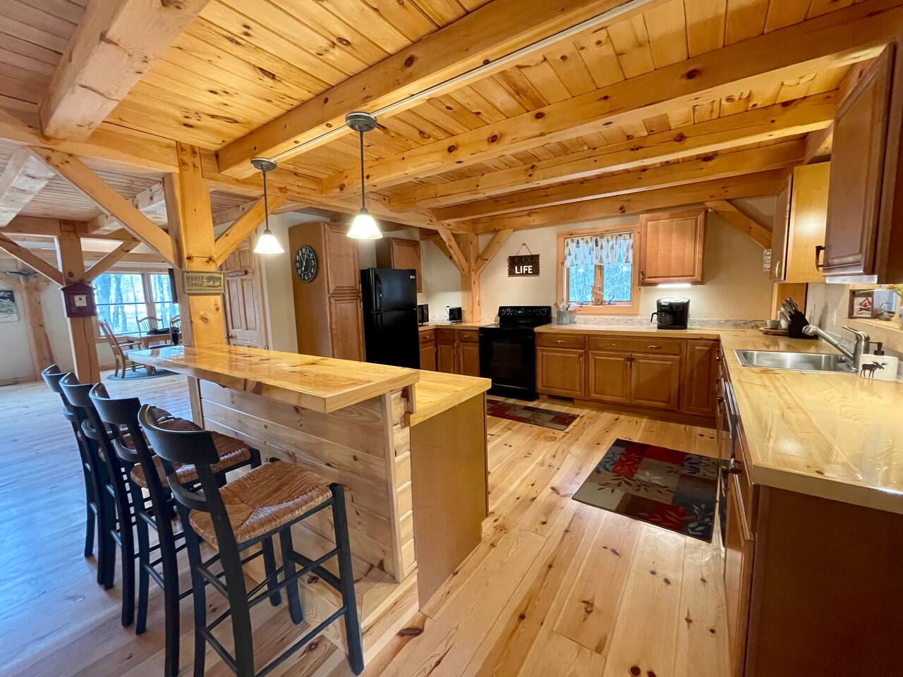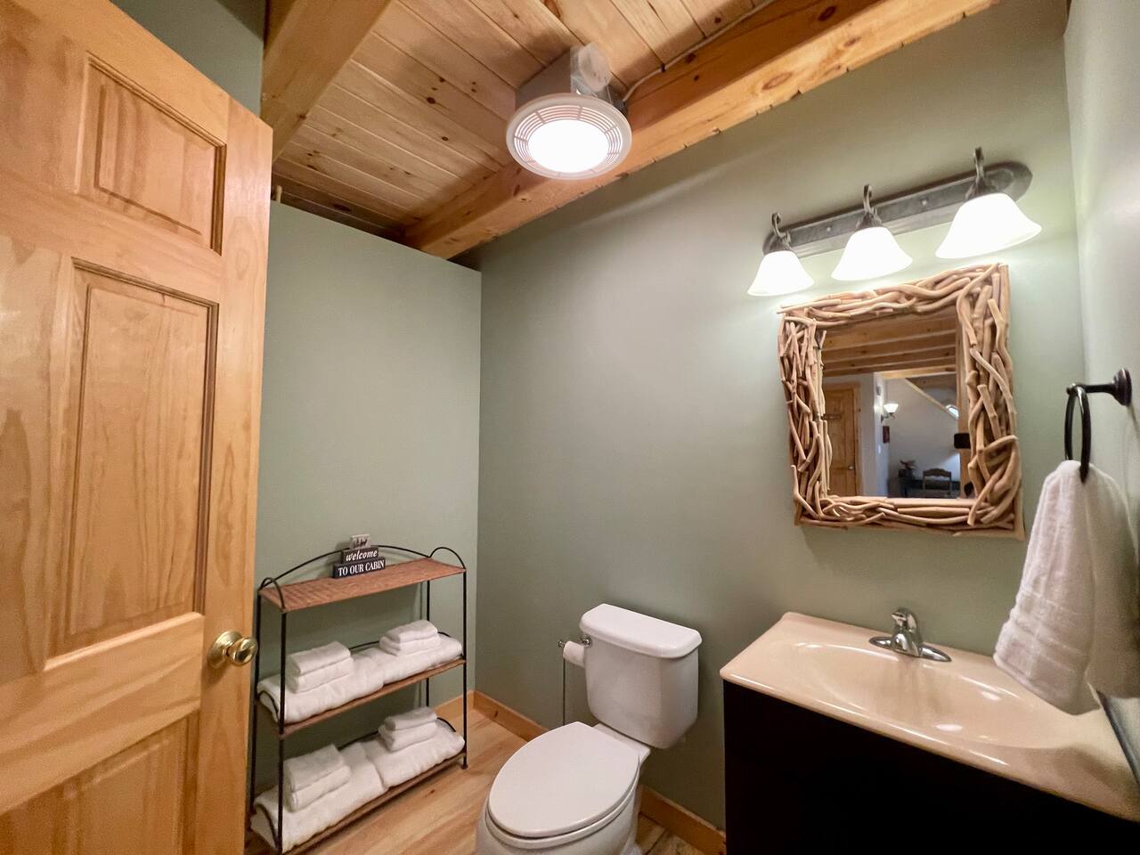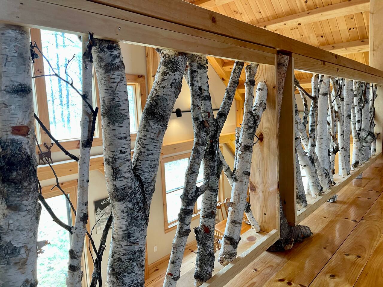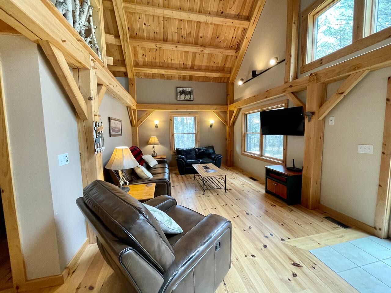 Our home is truly a unique gem. Crafted in traditional post and beam the cabin has a rich wood smell as soon as you enter it. One of our favorite aspects of the home is the Monsta' Skybox Seats (you may recognize the green color of the wall). The outdoor space is truly the show stopper. A private dock, fire pit area, and farmers porch will give you plenty to do outside.