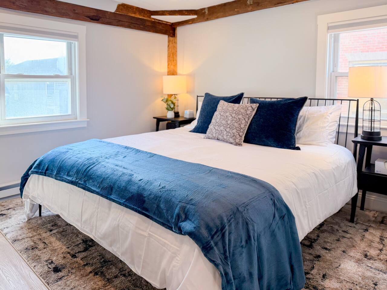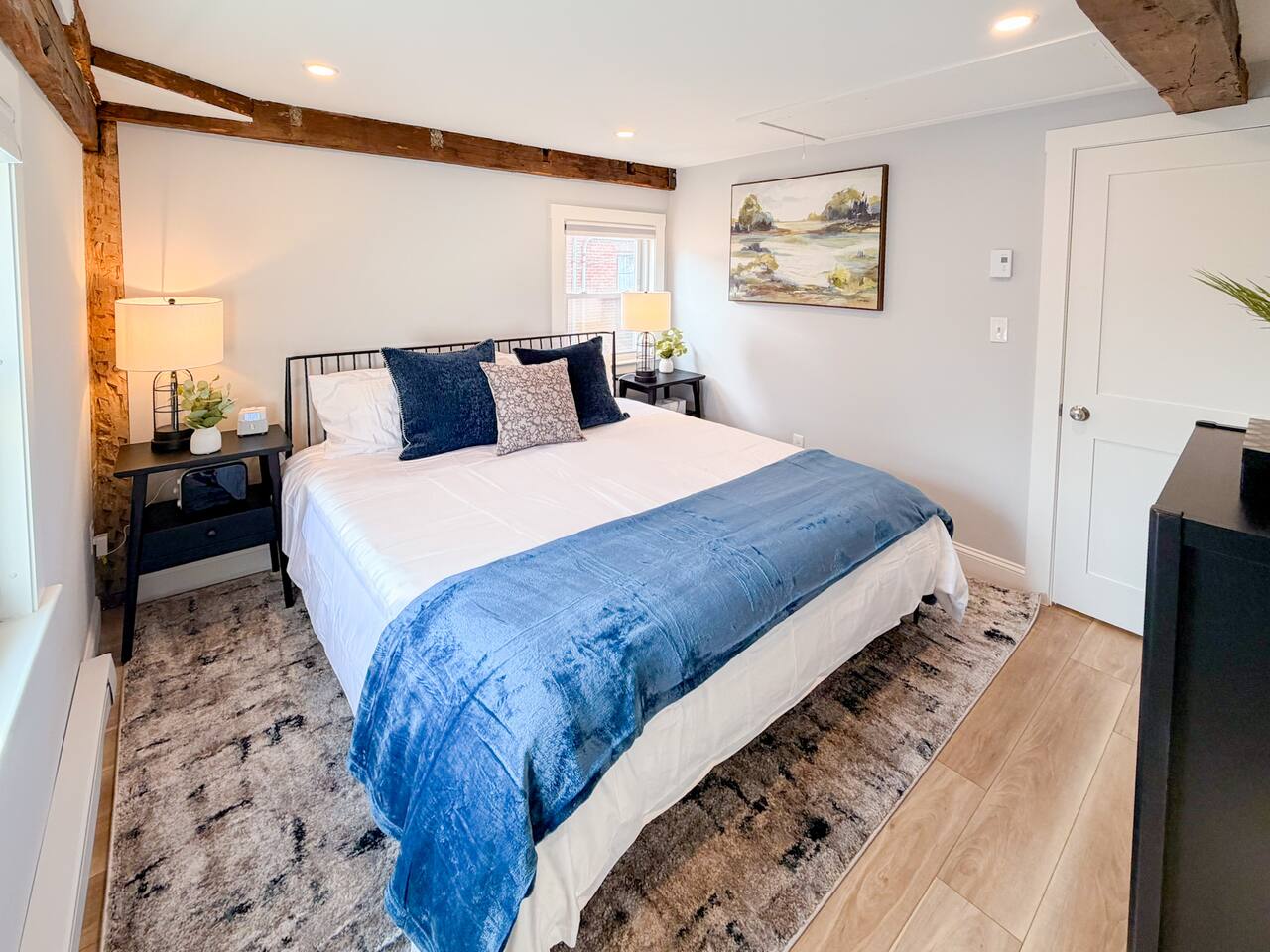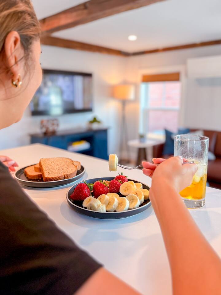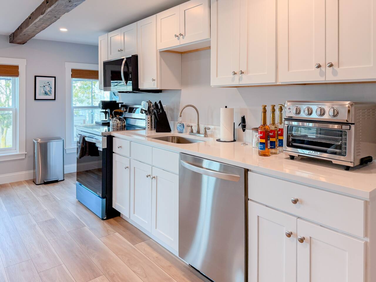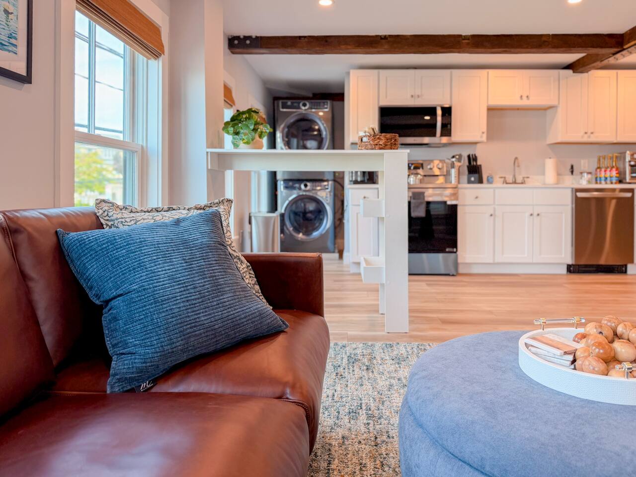 Step inside to find a bright, open-concept living space with exposed beams and coastal-inspired décor. The fully equipped kitchen includes stainless steel appliances, a dishwasher, and all the essentials for home-cooked meals. Relax in the cozy living area with plush seating and a smart TV, or enjoy morning coffee at the dining table with sunlight streaming through the windows. Both bedrooms feature comfortable queen beds, premium linens, and thoughtful touches for a restful stay. The modern bathroom is sparkling clean and stocked with fresh towels and toiletries for your convenience.