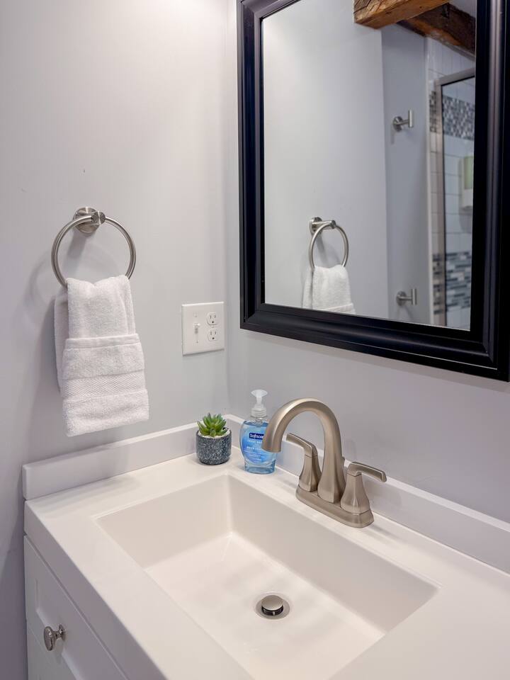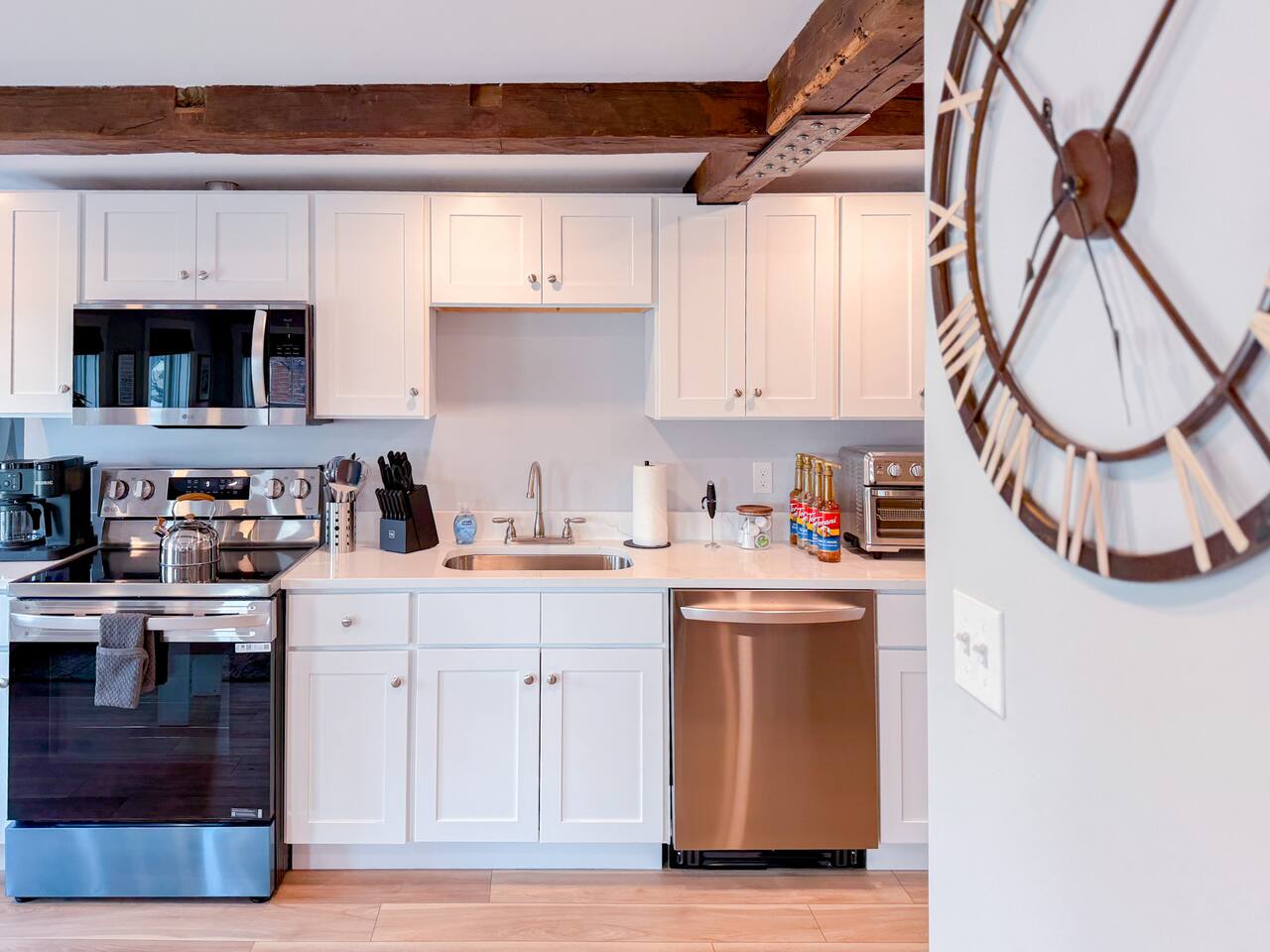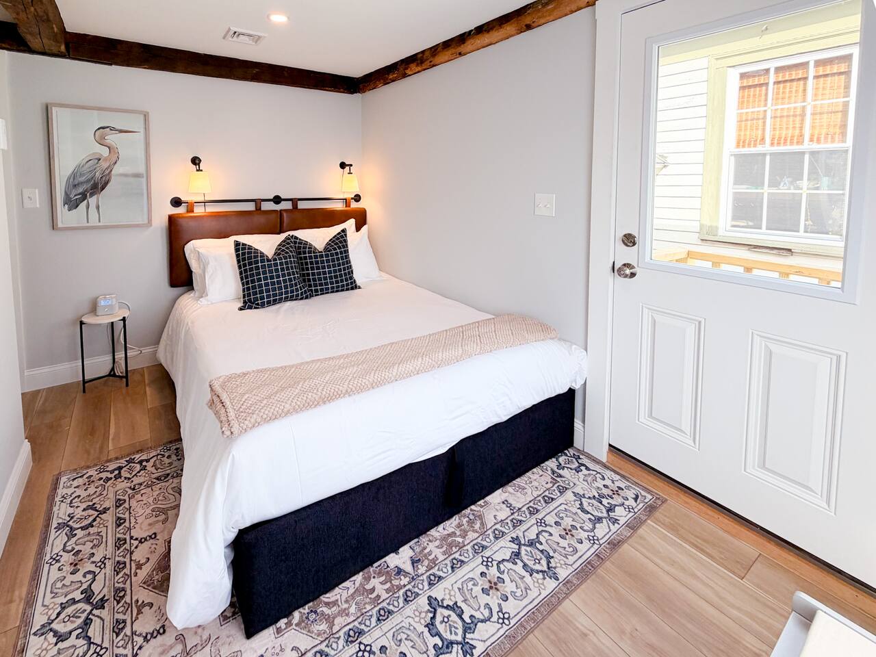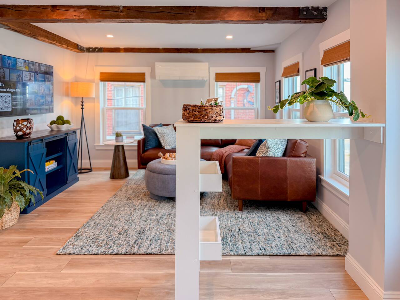 Step inside to find a bright, open-concept living space with exposed beams and coastal-inspired décor. The fully equipped kitchen includes stainless steel appliances, a dishwasher, and all the essentials for home-cooked meals. Relax in the cozy living area with plush seating and a smart TV, or enjoy morning coffee at the dining table with sunlight streaming through the windows. Both bedrooms feature comfortable queen beds, premium linens, and thoughtful touches for a restful stay. The modern bathroom is sparkling clean and stocked with fresh towels and toiletries for your convenience.