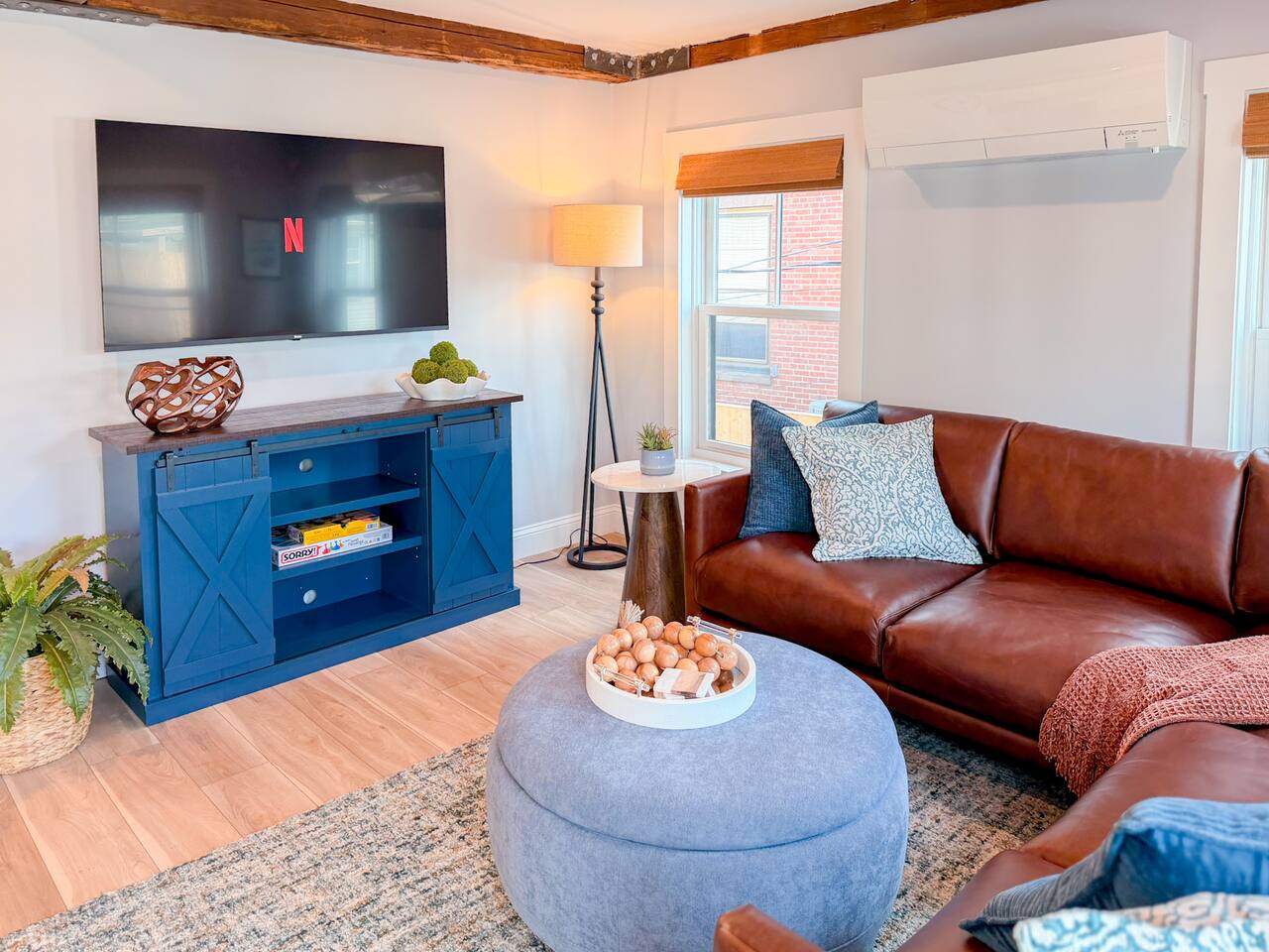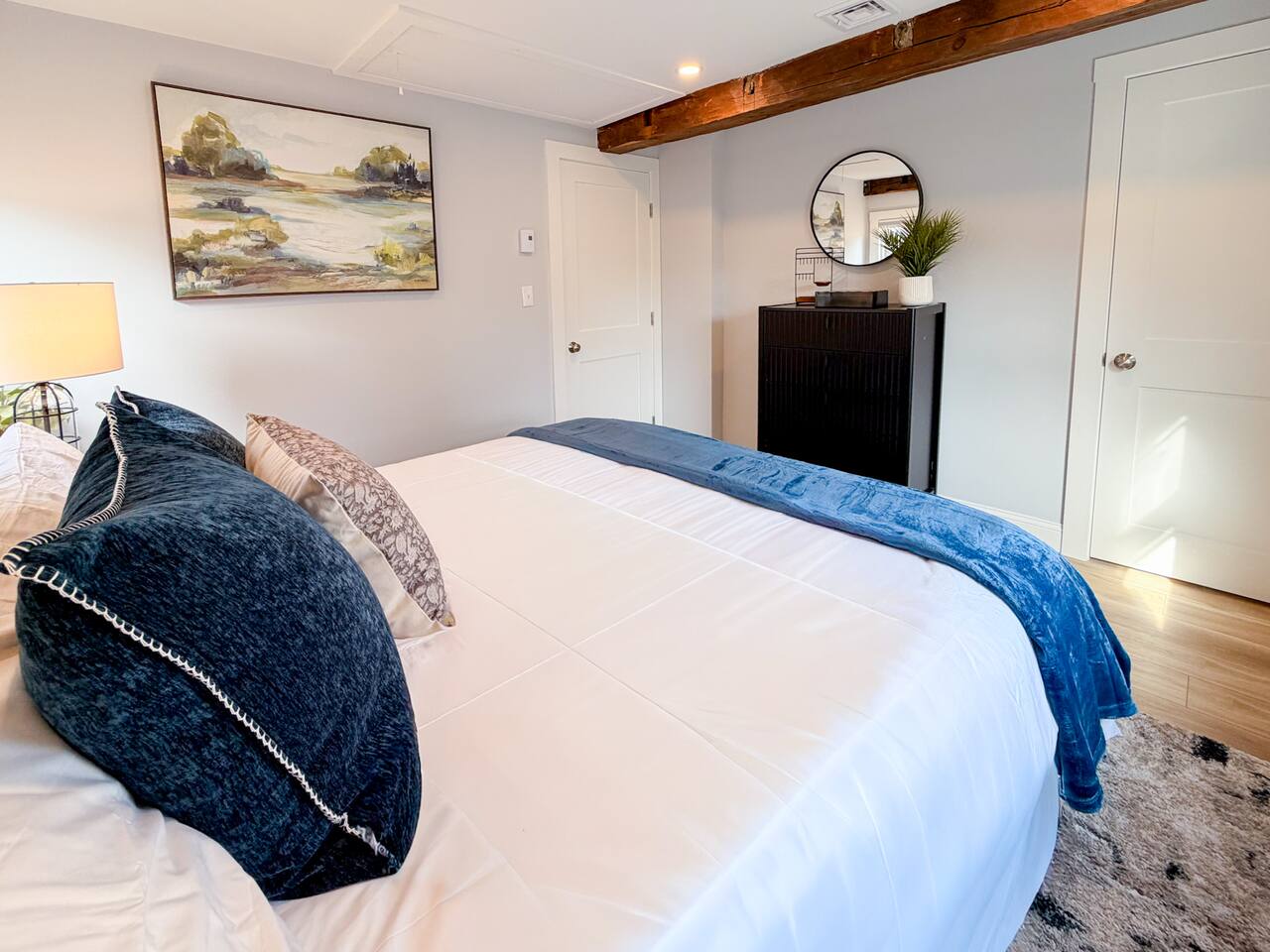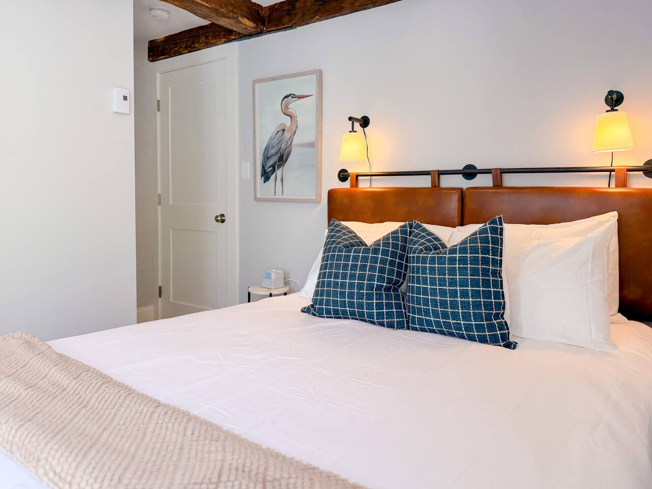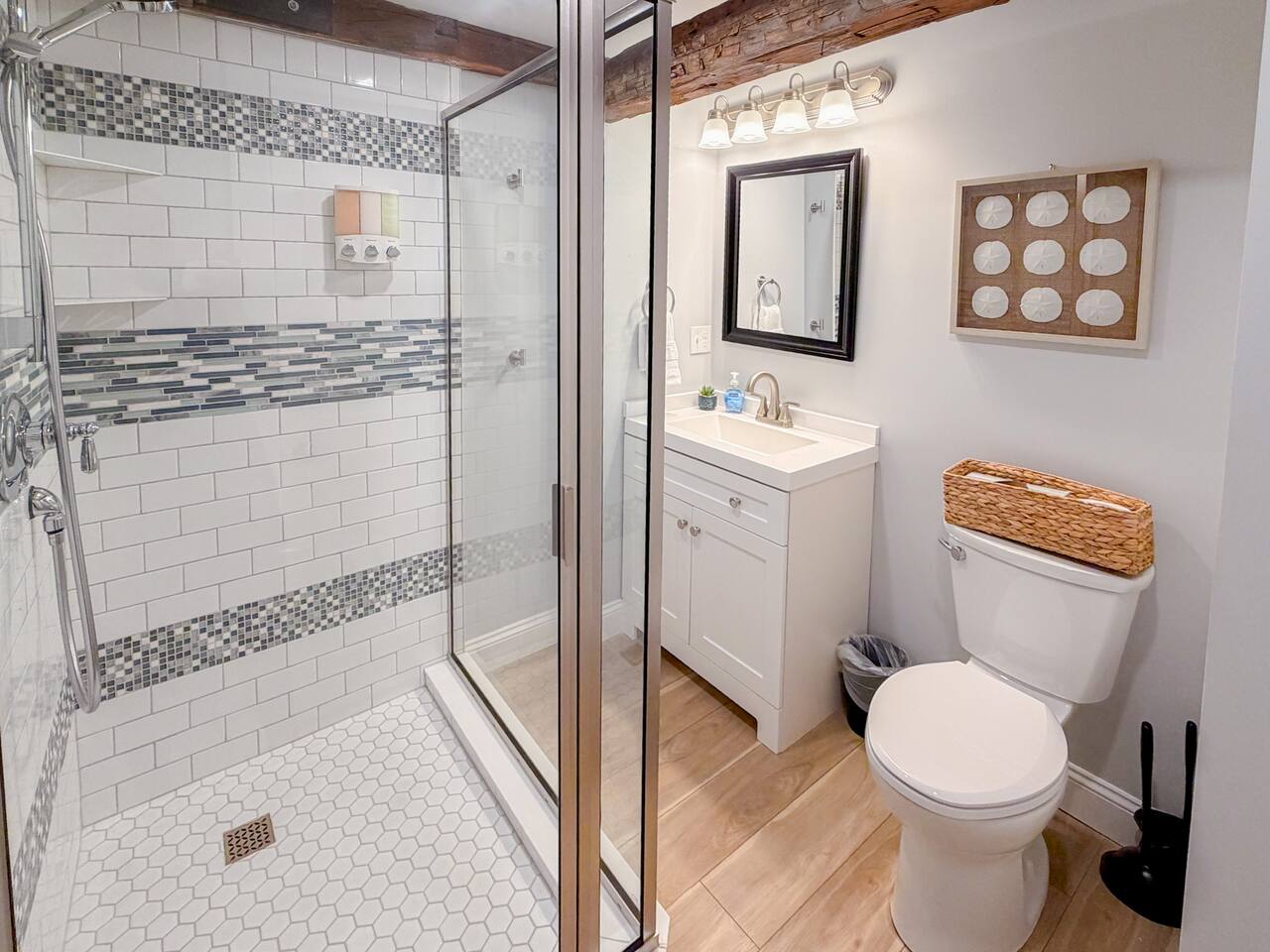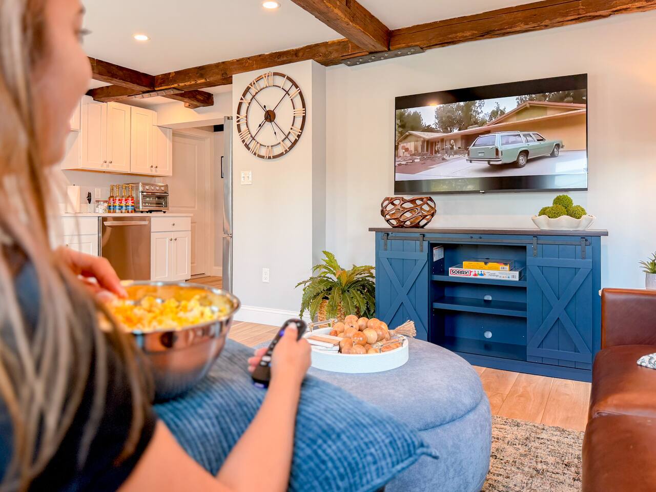 Step inside to find a bright, open-concept living space with exposed beams and coastal-inspired décor. The fully equipped kitchen includes stainless steel appliances, a dishwasher, and all the essentials for home-cooked meals. Relax in the cozy living area with plush seating and a smart TV, or enjoy morning coffee at the dining table with sunlight streaming through the windows. Both bedrooms feature comfortable queen beds, premium linens, and thoughtful touches for a restful stay. The modern bathroom is sparkling clean and stocked with fresh towels and toiletries for your convenience.