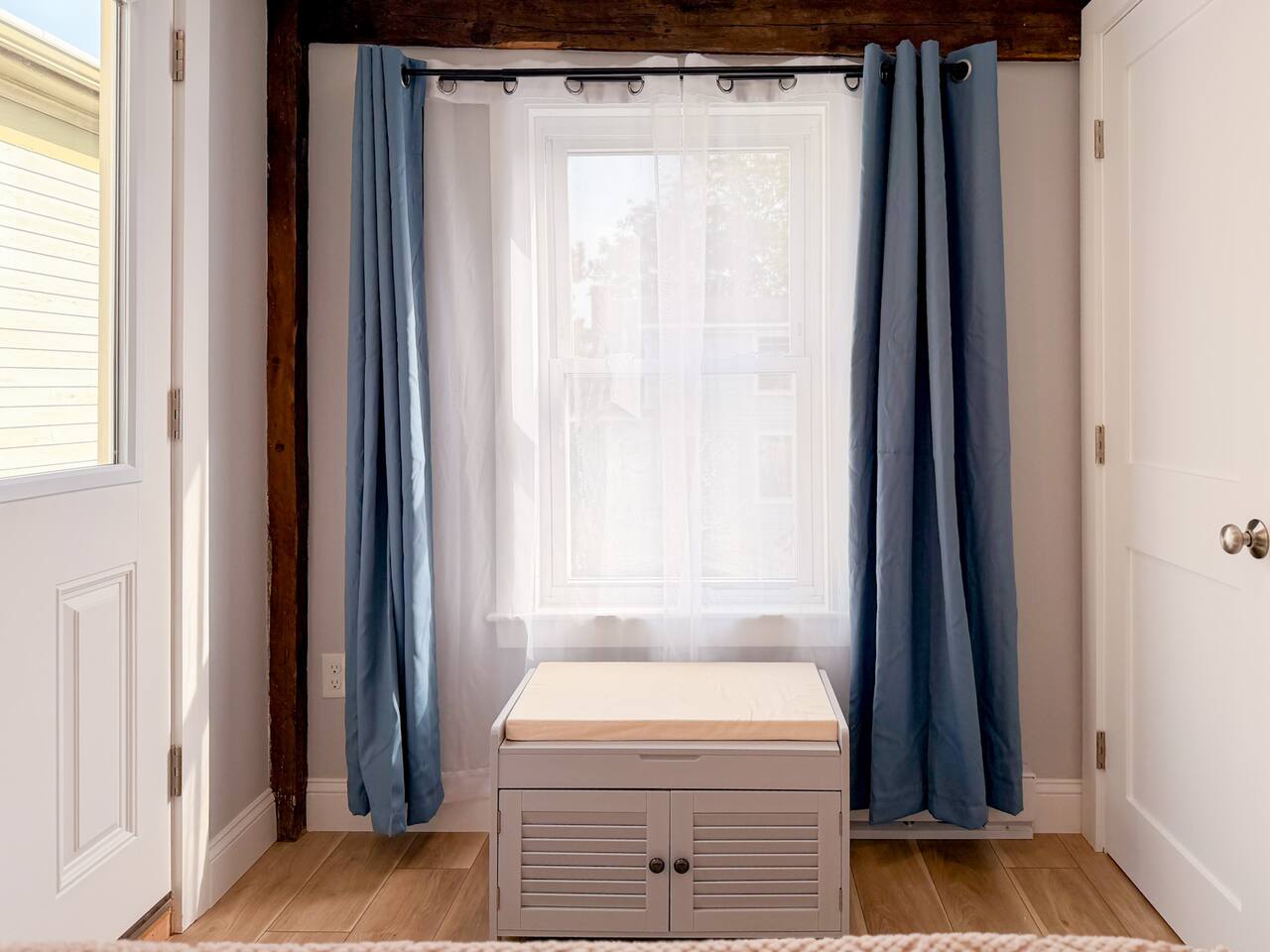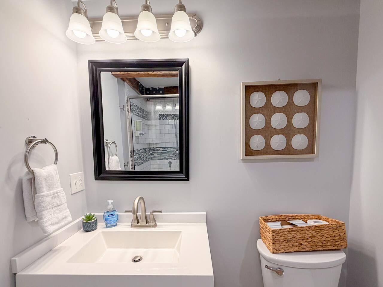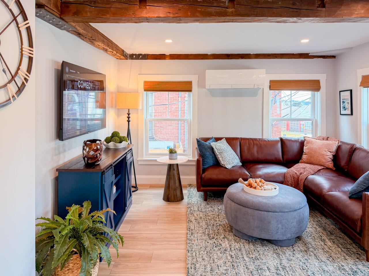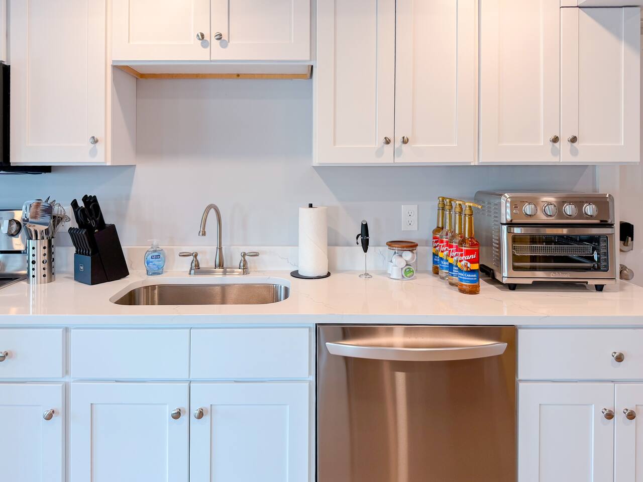 Step inside to find a bright, open-concept living space with exposed beams and coastal-inspired décor. The fully equipped kitchen includes stainless steel appliances, a dishwasher, and all the essentials for home-cooked meals. Relax in the cozy living area with plush seating and a smart TV, or enjoy morning coffee at the dining table with sunlight streaming through the windows. Both bedrooms feature comfortable queen beds, premium linens, and thoughtful touches for a restful stay. The modern bathroom is sparkling clean and stocked with fresh towels and toiletries for your convenience.