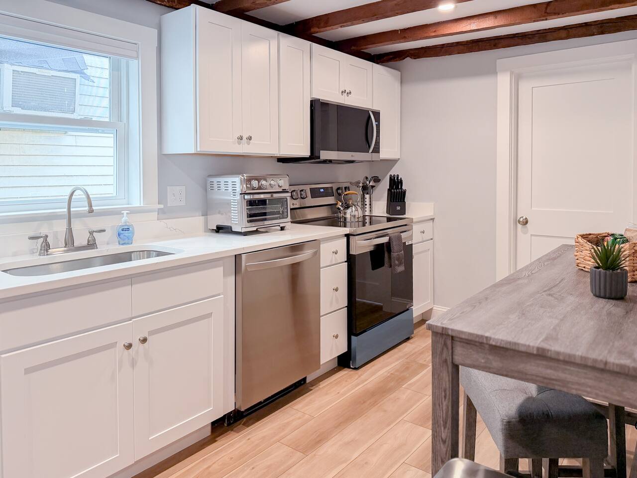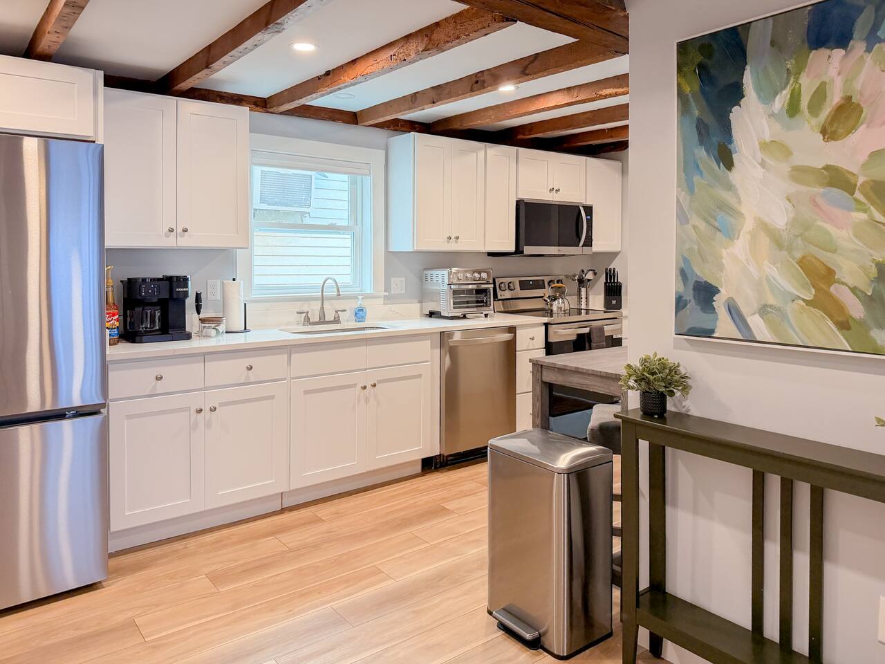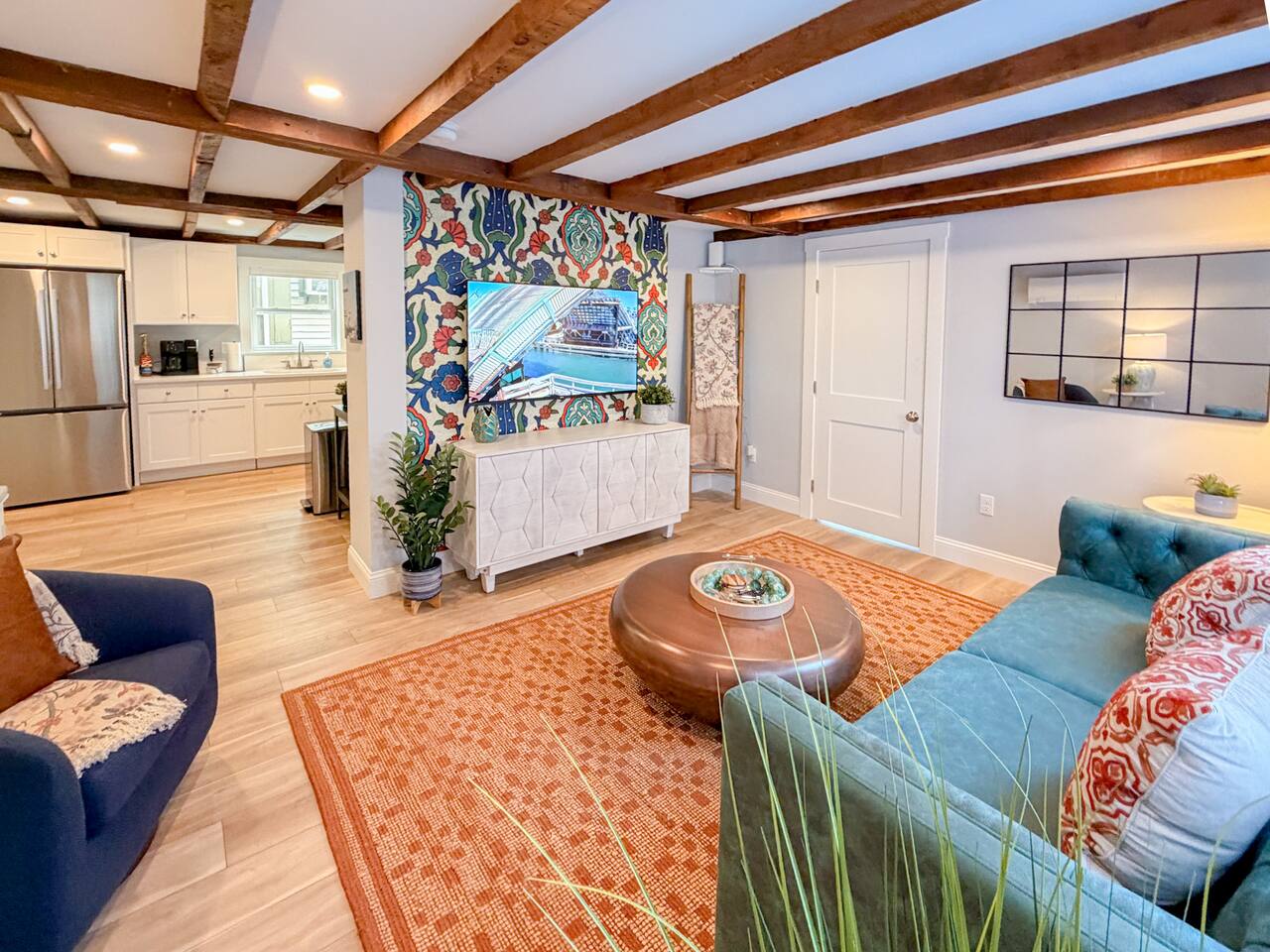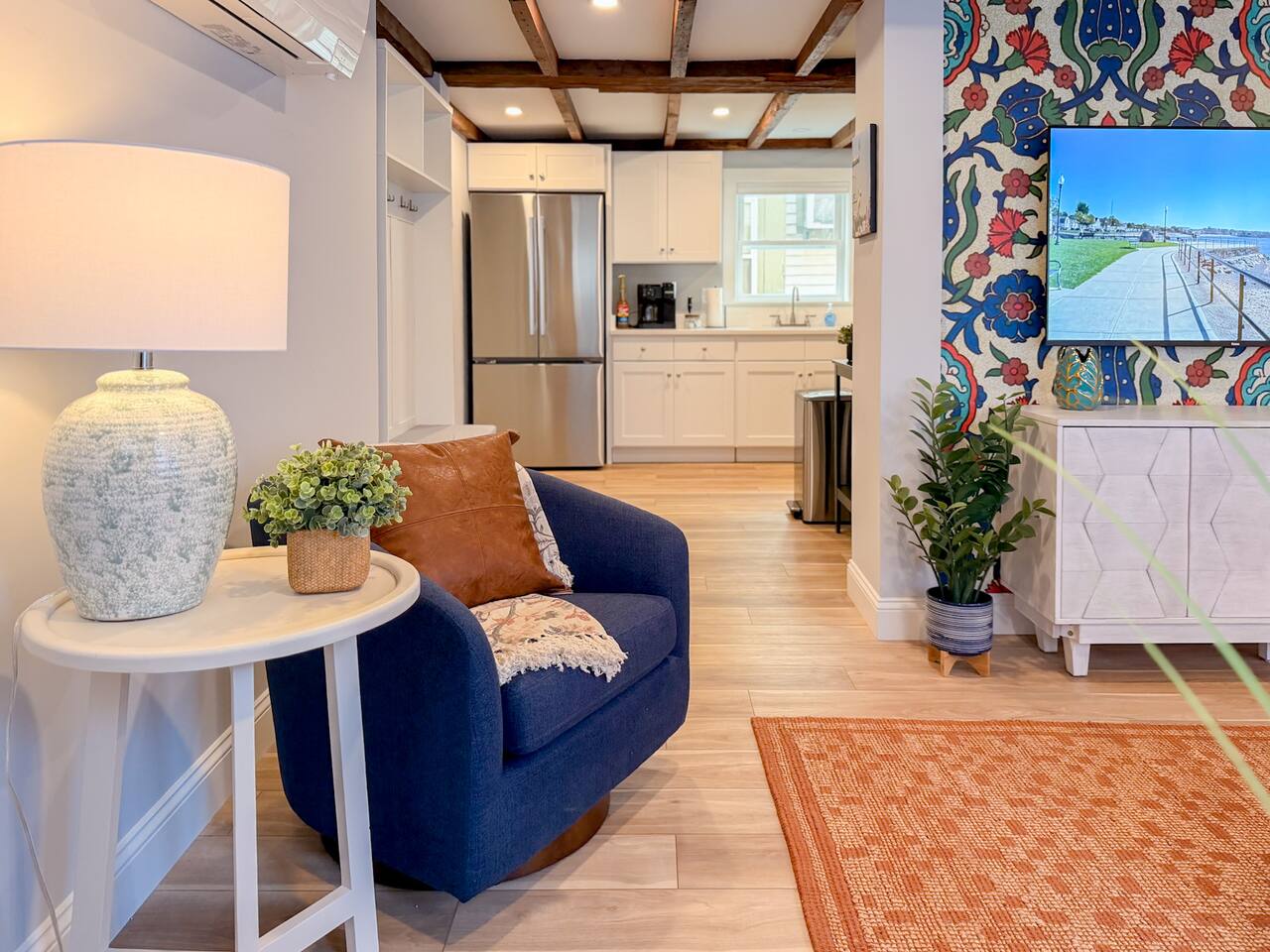✨ The Space Step inside and be greeted by a bright, airy living space featuring exposed beams, tasteful coastal décor, and soft lighting that creates a relaxing atmosphere. Unwind in the cozy living room, complete with comfortable seating and a smart TV for movie nights after a day of exploring the harbor. The modern kitchen is fully equipped with everything you need — from stainless steel appliances and a dishwasher to cookware, utensils, a coffee maker, and dining essentials. Whether you’re whipping up breakfast or enjoying a quiet dinner in, this space is designed for convenience and comfort. The bedroom features a plush queen bed with quality linens, ensuring a restful night’s sleep. The bathroom is spotless and well-appointed with fresh towels and basic toiletries for your stay.
